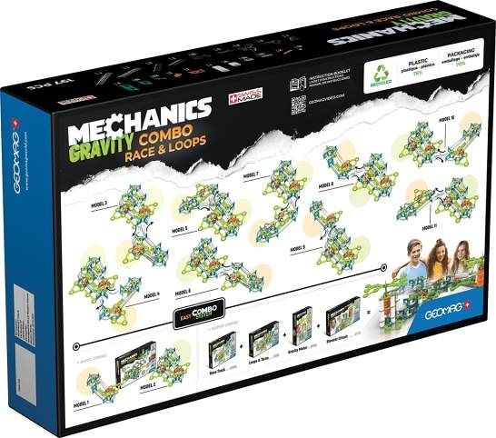 Se stavebnicí Geomag Mechanics Gravity Combo vytvoříte jedenáct různých okruhů a tratí. Nechte obíhat ocelové kuličky po vlastnoručně postavené dráze a sledujte, jak fungují fyzikální zákony. Stavebnice obsahuje 197 dílků. Všechny barevné části stavebnice jsou z recyklovaného plastu. Vhodné pro každého od 8 let, vyrobeno ve Švýcarsku.