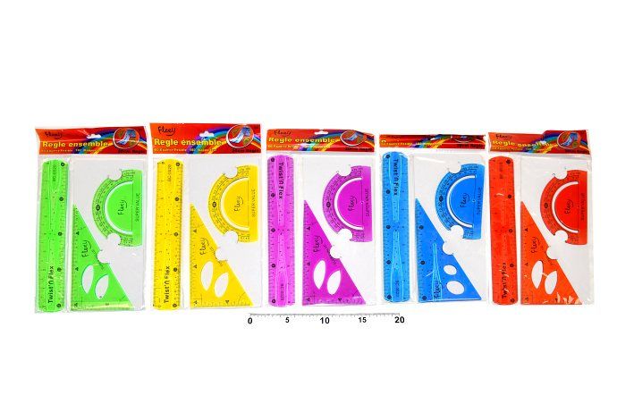 Geometrická sada obsahuje: • rovné pravítko 20 cm • trojúhelník 13 cm • úhloměr 180°/10 cm Barevné varianty - červená, modrá, zelená, fialová, žlutá