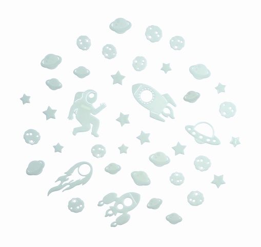 Sada fluorescenčních hvězdiček, astronauta, vesmírné lodi a dalších motivů, které po nasvícení ve tmě svítí. Dekorace vhodná k nalepení na stěnu, strop či nábytek. Včetně lepicí gumy. Sada obsahuje 41 ks.