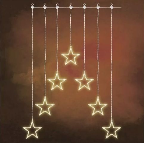 Závěs hvězdy 115 LED vhodné do interiéru, na zavěšenínorma IP20počet hvězd: 7počet LED: 10barva světla: teplá bílározměr: 67 x 125 cm+ 5 m přívodní kabeltyp napájení: 230 Vbarva drátu: stříbrná