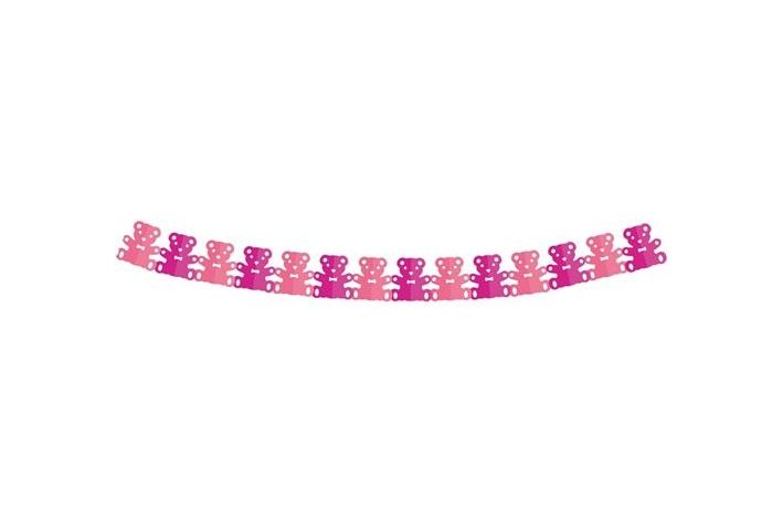 Papírová girlanda znázorňující medvídky v růžové barvě, je oboustranná. Jednotliví medvědi jsou k sobě uvázáni tenkou, pevnou nití. Délka 3,6m, upevňuje se pomocí provázků.