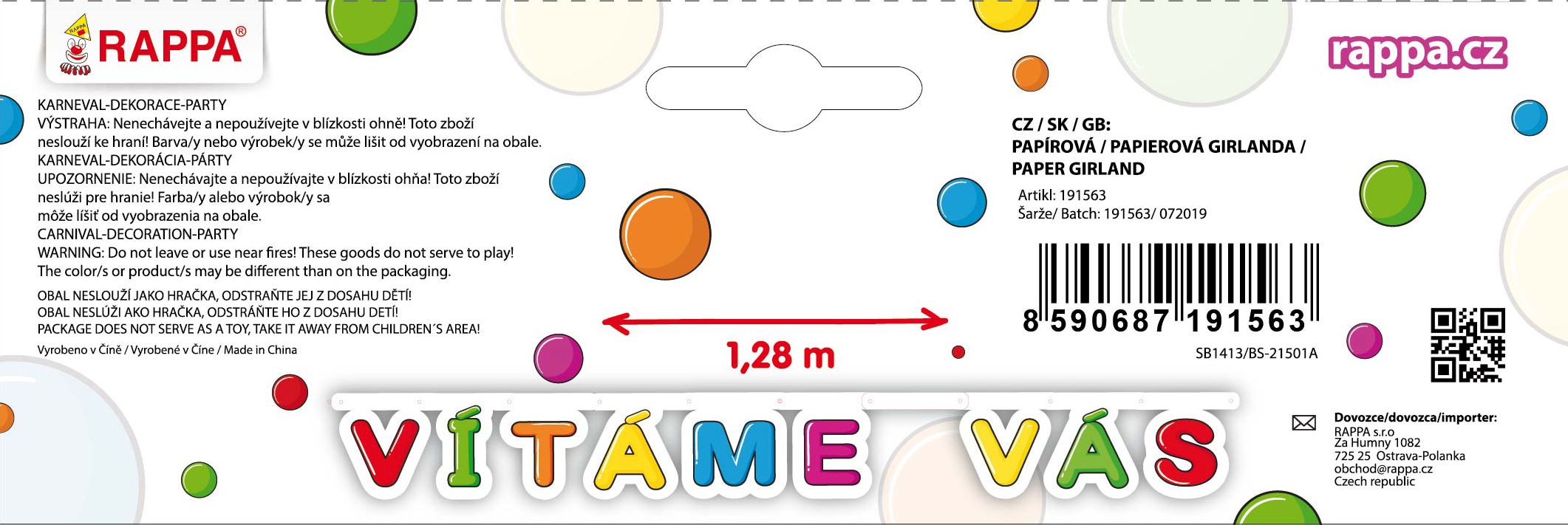 Super tip na oslavu - girlanda s nápisem VÍTÁME VÁS v barevném provedení! Stačí roztáhnout a pověsit. S touto barevnou girlandou bude tvoje výzdoba dokonalá! Délka cca 1,28 m.