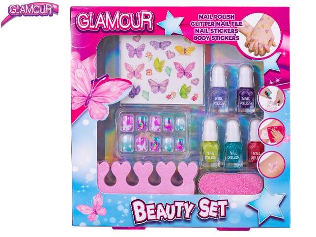 Glamour sada krásy s laky na nehty, pilníkem a nálepkami na tělo a nehty v krabičce