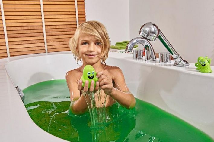 Prášek Glibbi přemění vodu do zeleného slizu a zábavné koupání může začít. Stačí nasypat, zamíchat a Glibbi sliz je připraven. Je to dost slizký? Po koupeli stačí jen doplnit vodu a vytáhnout špunt.