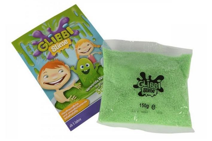 Prášek Glibbi přemění vodu do zeleného slizu a zábavné koupání může začít. Stačí nasypat, zamíchat a Glibbi sliz je připraven.