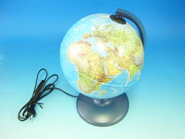 Světelný glóbus, zeměpisná mapa, po rozsvícení mapa politická. Podstavec a půlpoledník z černého „ kouřového“ plastu.