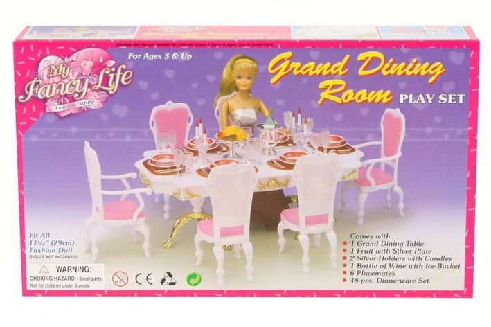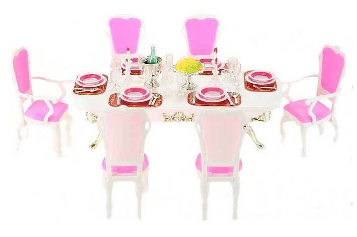 Glorie jídelní stůl obsahuje velký plastový stůl o rozměrech cca 28,5 x 10 x 18 cm, 6 židlí (dvě s područkami) 14,5 x 7 x 5,5 cm. Dále prostření stolu: stojan s jídlem, lahev vína a chadicí nádobu, 2 stojany se svíčkami, 12 skleniček, 6 prostírání, 12 talířů, příbory. Panenka není součástí balení.