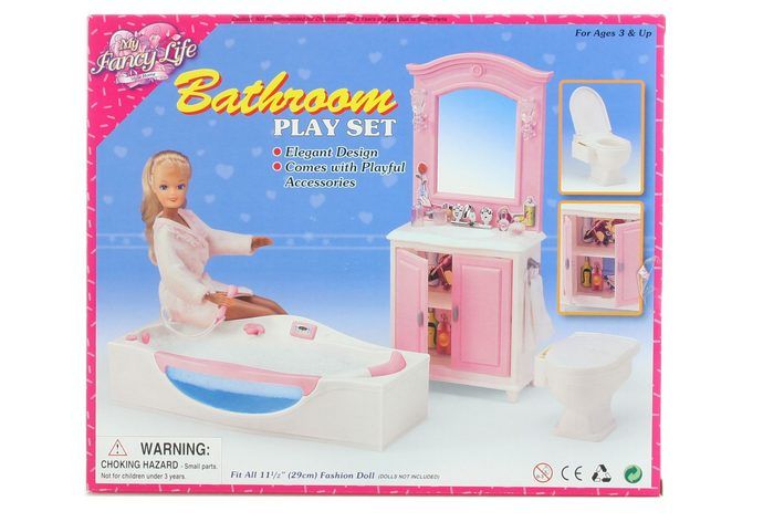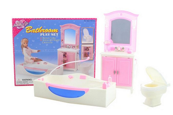 Glorie Koupelna obsahuje toaletku s umyvadlem 12 x 27 cm , vanu 26 x 12 cm a toaletu 10 x 7 cm. Součástí jsou také doplňky (kosmetika, mýdlo, ručník atd.). Vyrobeno z plastu. Panenka není součástí balení. Rozměry balení cca 30 x 25 x 7 cm.