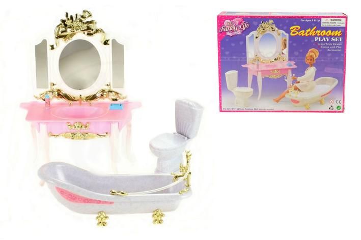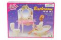 Glorie Koupelna obsahuje toaletku s umyvadlem o rozměrech cca 23x 10 x 30 cm, vanu o rozměrech cca 10 x 25 x 8,5 cm a s WC toaletou cca 6 x 10,5 x 12 cm. Vyrobeno z plastu. Panenka není součástí balení.