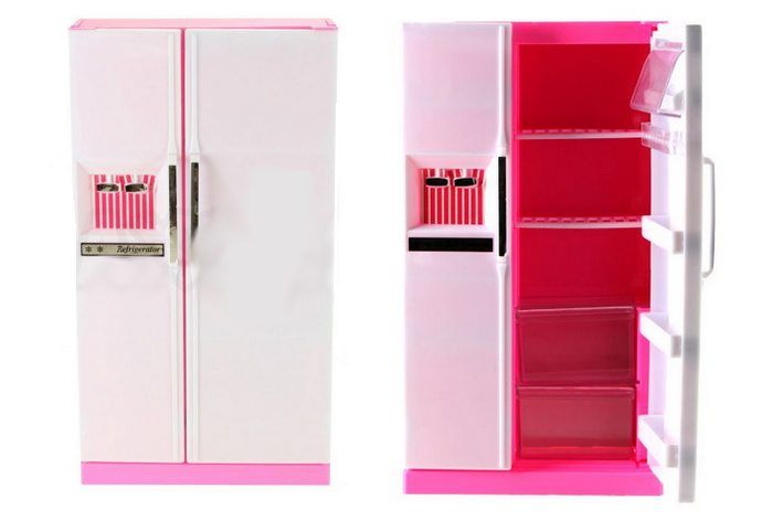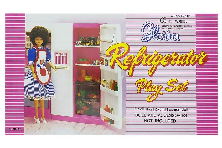 Glorie Lednice - balení obsahuje plastovu lednici o rozměru cca 17,5 x 6 x 31 cm rozměr uzavřené lednice. Uvnitř přihrádky,poličky a šuplíčky na potraviny a doplňky.