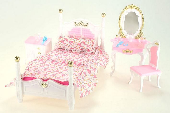 Glorie Ložnice obsahuje plastovou postel o rozměrech cca 16 x 34 x 18 cm s přehozem přes postel a polštářkem, kosmetický stolek o rozměrech cca 13 x 8 x 22 cm s doplňky pro panneky - hřebínek, náramek, kartáč a lahvičky, křeslo cca 7 x 7 x 13 cm, noční stolek cca 8,5 x 6 x 8 cm. Panenka není součástí balení.