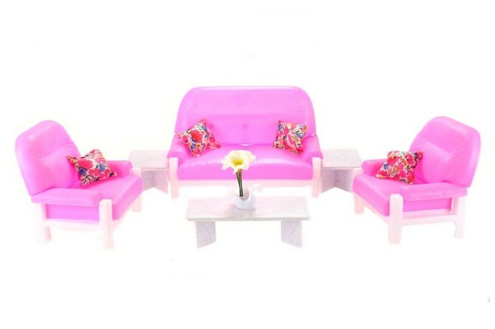 Glorie Obývák obsahuje plastový gauč pro panenky o rozměrech cca 22 cm x 11 cm x 13 cm , 2 plastová křesla o rozměrech cca 13,5 cm x 11 cm x 13 cm, plastový stolek cca 7,5 cm x 15 cm x 5 cm s doplňkem na stolek - plastová labuť s květy, 2 plastové taburety cca 7,5 cm x 4 cm. Jako doplňky jsou 4 polštářky. Součástí balení není panenka a panáček.