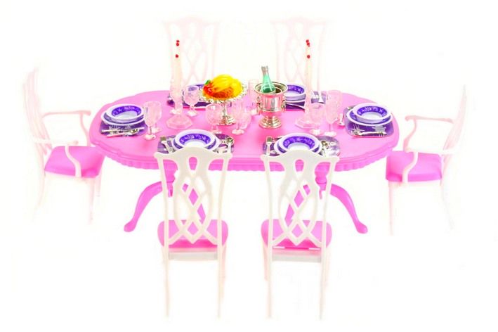 Plastový nábytek bílo růžové barvy v luxusním stylu, kterým si holčičky mohou vybavit jídelnu v domečku pro panenky. Panenka není součástí balení. Stůl je zaplněn jídelním servisem ladícím k tomuto vybavení.