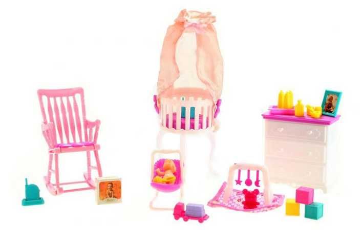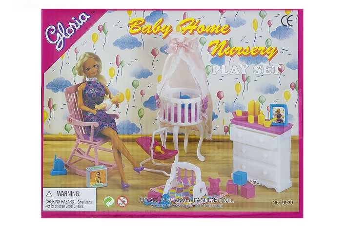 Glorie sada pro miminko obsahuje dětskou komodu s výsuvným šuplíkem o rozměrech 10 x 11 x 4 cm, dětskou postýlku s nebesy o průměru 8,5 cm, dětské lehátko (šířka 9,5 cm), houpací křeslo (výška 15 cm), dětské hračky, potřeby pro miminko, obrázek chůvičku a samotné miminko (výška 6 cm). Panenka není součástí balení.