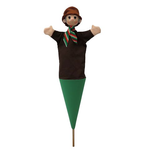 Kornoutový maňásek "3v1" = loutka+maňásek+schránka na drobnosti. Ovládá se dřevěnou tyčkou, kterou také schováte celou postavičku do kornoutu. Otvorem na zádech ovládáte ruce, tak jako u maňásků, nebo vložíte drobné dárky do kornoutu.