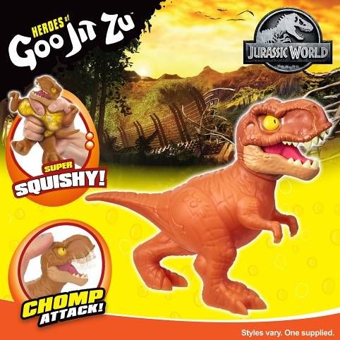 Vstupte do Jurského světa zcela novým způsobem! Od tvůrců Heroes of Goo Jit Zu přicházejí ti nejroztažnější dinosauři, kteří vyskošili přímo z filmového plátna! Seznamte se s T-REXEM!Uchopte a natáhněte T-REXOVI ruce a nohy. Toto neuvěřitelné realistické, ohebné prehistorické stvoření se může natáhnout až na 3násobek své normální velikosti! Když jej pustíte, vrátí se zpět do původního tvaru a velikosti!Super elastické a super pevné, Goo Jit Zu dinosauři poskytují chlapcům a dívkám zcela nový způsob, jak si hrát s akčními figurkami bez nepořádku.Sbírejte všechny oblíbené dinosaury z Jurského světa!