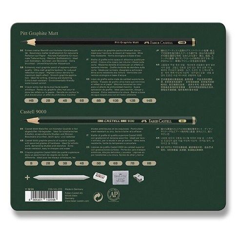 Grafitová tužka Castell 9000 a Pitt Monochrome s doplňkovým příslušenstvím v odolné plechové krabičce. Sada 20 ks.