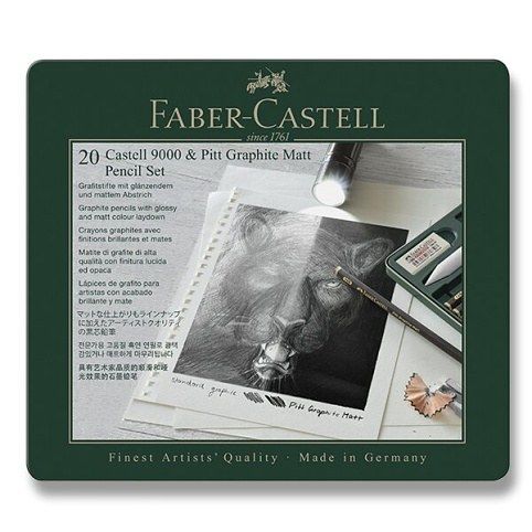 Grafitová tužka Castell 9000 a Pitt Monochrome s doplňkovým příslušenstvím v odolné plechové krabičce. Sada 20 ks.