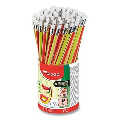 Stojánek 72 ks bezdřevé grafitové tužky Maped Kidy Learn Grip s pryží je speciálně navržená pro děti. Tužka má trojhranný tvar. Tělo tužky je s protiskluzovým povrchem pro snadnou manipulaci.