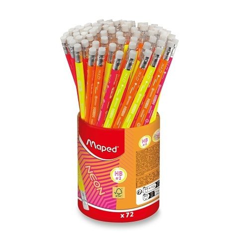 Stojánek 72 kusů dřevěných grafitových tužek Maped Neon s pryží v atraktivním neonovém designu. Mají vysoce kvalitní tuhu a trojhranný tvar pro lepší a pohodlnější uchopení.