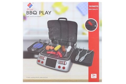 Gril na baterie s doplňky. Když gril naplníte vodou, bude po zmáčknutí tlačítka dělat páru a vydávát zvuky. Balení také obsahuje kleště, talířek, kukuřici, párky a mnoho dalších doplňků. Napájení na 3 AA baterie (nejsou součástí). Rozměry balení cca 24,5 x 25 x 13,5 cm. Věk 3+