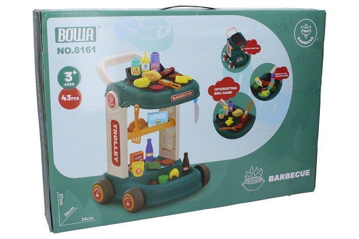 Grilovací vozík. Rozměry 34x36x37 cm. Balení obsahuje vozík na kolečkách, potraviny, nádobí, příslušenství na grilování.
