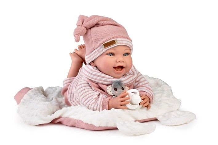 Zátěžová panenka miminko bez zvuku s měkkým látkovým tělem. Ruce a nohy jsou k tělu přichyceny kloubem. Miminko je polohovací a může i sedět, avšak díky zatížení hlavičky jsou její pohyby odlišné od ostatních miminek. Hlavička se jí na krku pohybuje v závislosti na celkové manipulaci s panenkou a v náručí se chová jako skutečné miminko, kterému je potřeba hlavičku ještě přidržovat. Díky zátěžovým výplním v hlavě a na zadečku má tento typ panenky miminka vyšší váhu oproti ostatním (cca 1800 g) a je vnímána jako manipulační panenka, která je vhodná nejen pro děti, ale i pro seniory nebo jako pomůcka pro inkluzi a osoby se speciálními potřebami. Tyto panenky se používají v ergoterapii, kde pomáhají rozvíjet jemnou motoriku a koordinaci u dětí i dospělých. Jsou také výborným pomocníkem při práci s lidmi s demencí, kde navozují klientům pocity klidu a bezpečí. Zátěžová výplň panenky: látkové pytlíky plněné křemičitým pískem. Velikost 42 cm. Ručně vyrobeno ve Španělsku, baleno v dárkové krabici. Doporučený věk od 3 let.