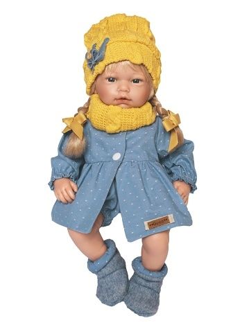 Zvuková panenka s měkkým látkovým tělem, která po zatlačení na hrudník začne vydávat reálný zvuk smějícího se dítěte. Panenka má delší vlásky "rostlé" po celé hlavě, které se dají česat. Ruce a nohy jsou k tělu přichyceny kloubem. Miminko je polohovací a může i sedět. Velikost 38 cm. Ručně vyrobeno ve Španělsku, baleno v dárkové krabici. Doporučený věk od 3 let. Součástí balení je 3 x knoflíková baterie LR44 s návodem na její výměnu. Baterie jsou spotřební zboží a proto jejich vybití není důvodem k reklamaci panenky.