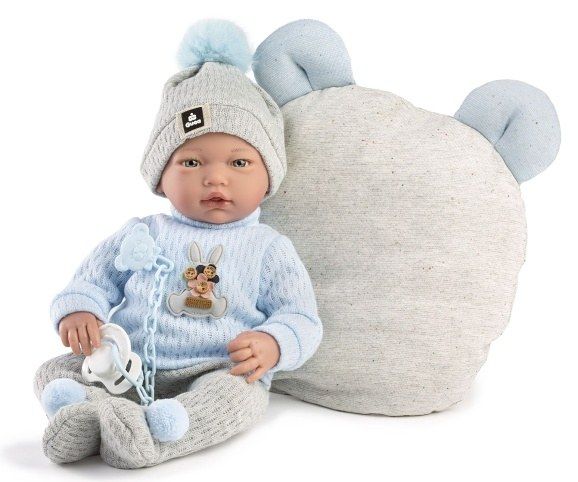 Zvuková panenka miminko s měkkým látkovým tělem, která po zatlačení na hrudník začne vydávat reálný zvuk smějícího se dítěte. Ruce a nohy jsou k tělu přichyceny kloubem. Miminko je polohovací a může i sedět. Dudlík v balení slouží pouze jako doplněk. Velikost 38 cm. Ručně vyrobeno ve Španělsku, baleno v dárkové krabici. Doporučený věk od 3 let. Součástí balení je 3 x knoflíková baterie LR44 s návodem na její výměnu. Baterie jsou spotřební zboží a proto jejich vybití není důvodem k reklamaci panenky.