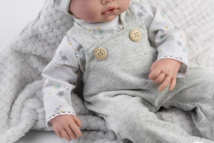 Zvuková panenka miminko s měkkým látkovým tělem, která po zatlačení na hrudník začne vydávat reálný zvuk smějícího se dítěte. Ruce a nohy jsou k tělu přichyceny kloubem. Miminko je polohovací a může i sedět. Velikost 38 cm. Ručně vyrobeno ve Španělsku, baleno v dárkové krabici. Doporučený věk od 3 let. Součástí balení je 3 x knoflíková baterie LR44 s návodem na její výměnu. Baterie jsou spotřební zboží a proto jejich vybití není důvodem k reklamaci panenky.