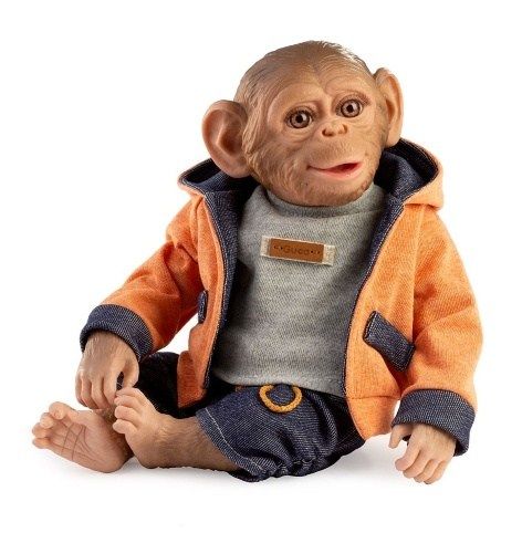 Veselé a roztomilé opičí miminko bez zvuku s měkkým látkovým tělem. Hlava a končetiny jsou vyrobené z kvalitního vinylu. Ruce a nohy jsou k tělu přichyceny kloubem. Opičí miminko je polohovací a může i sedět nebo se dá pověsit za ruce nebo nohy. Velikost 32 cm. Ručně vyrobeno ve Španělsku, baleno v dárkové krabici. Doporučený věk od 3 let.