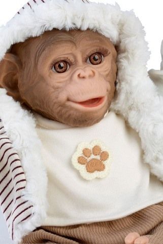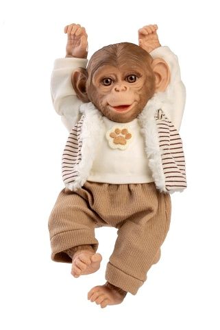 Veselé a roztomilé opičí miminko bez zvuku s měkkým látkovým tělem. Hlava a končetiny jsou vyrobené z kvalitního vinylu. Ruce a nohy jsou k tělu přichyceny kloubem. Opičí miminko je polohovací a může i sedět nebo se dá pověsit za ruce nebo nohy. Velikost 32 cm. Ručně vyrobeno ve Španělsku, baleno v dárkové krabici. Doporučený věk od 3 let.