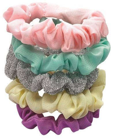 Sada pěti různobarevných gumiček, známých jako scrunchies, které perfektně drží ve vlasech.