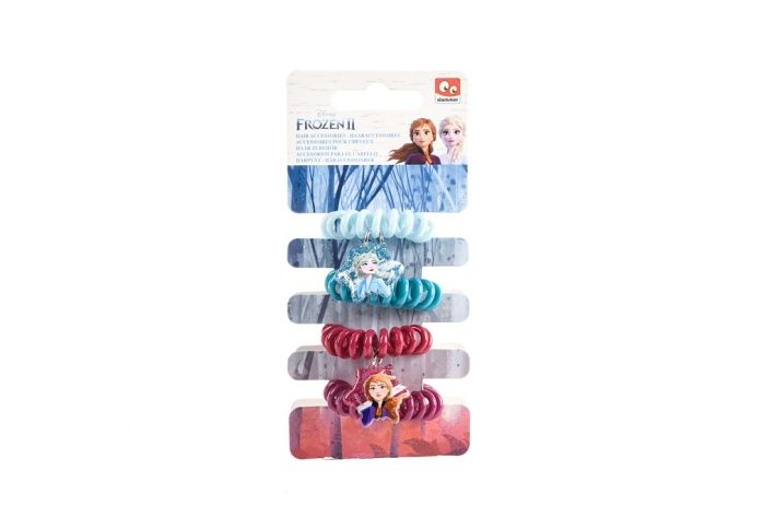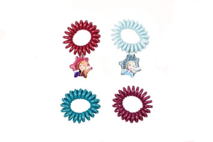 Čtyři různobarevné spirálové gumičky do vlasů. Dvě s přívěskem Ledové království 2.