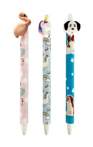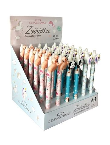 Gumovatelné gelové pero Zvírátka je ideálním pomocníkem pro opravu vašich chyb. Napsaný text lze snadno vymazat pomocí gumy umístené na konci pera a následne prepsat. Tento produkt zaujme atraktivním designem v pastelových barvách se zvírecími motivy na klipu, mezi které patrí plamenák, pejsek a jednorožec. Pero má hrot o šíri 0,5 mm a modrý inkoust. Je dodáváno v displeji po 36 kusech. Vymenitelná nápln: Nápln do gumovatelného pera s motivem.