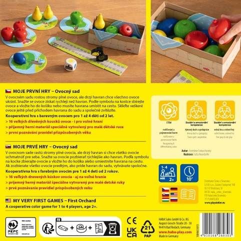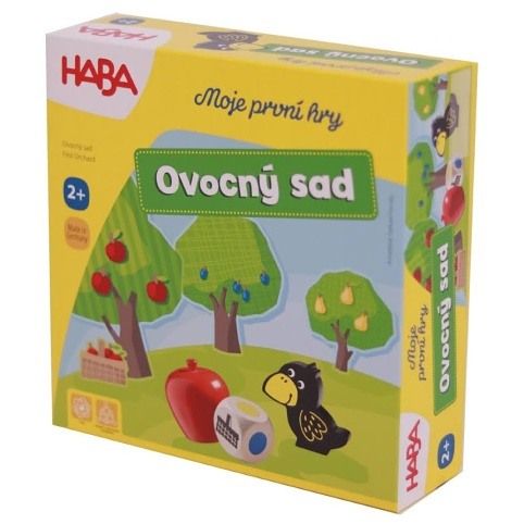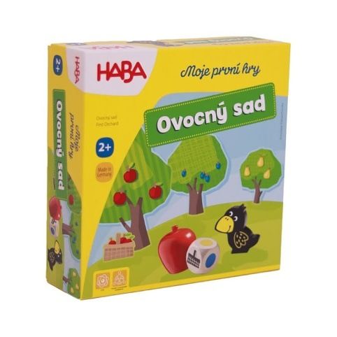 Haba Moje první hry pro děti Ovocný sad CZ verze. Kooperativní hra. Skliďte veškeré ovoce ještě před příletem havrana do sadu, a společně zvítězíte. 1-4 hráči, 10 minut.
