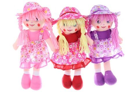 Látková panenka o velikosti cca 35 x 15 x 8 cm. Panenka po zmáčknutí bříška zpívá. Napájení na 3 AG13 baterie (jsou součástí). Panenka má měkké tělíčko. Baleno v igelitovém sáčku. Věk 0+
