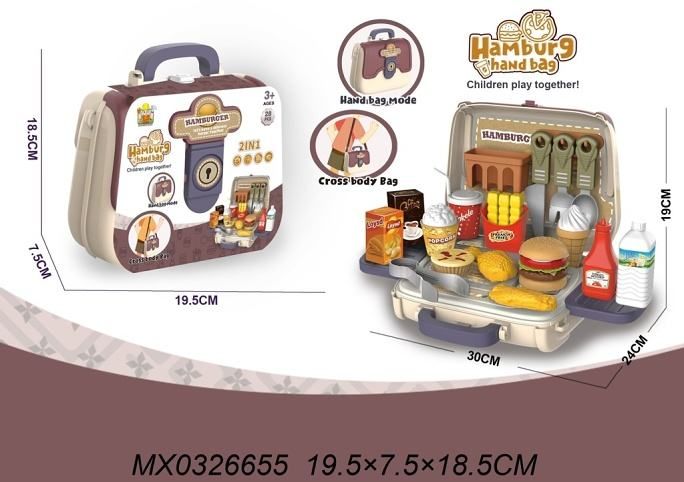 Hambugerová sada obsahuje příbor, jídlo, kvu, mléko, čaj. Všechny doplňky jsou uschované v praktickém kufříku.