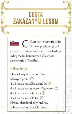 Cílem hry je vytvořit řadu z 10-ti kartiček, které symbolizují cestu Zapovězeným lesem, poražení Dolores Umbridgeové a nalezení Testrálů. Originální stolní rodinná hra pro malé i velké hráče, se kterou se stanete součástí známého příběhu Harry Pottera. Díky jednoduchým pravidlům si ji s chutí zahraje jak skalní fanoušek hrdinů z Bradavic, tak třeba i dědeček, který příběhy Joanne Rowlingové nezná. Vyrobeno v ČR.