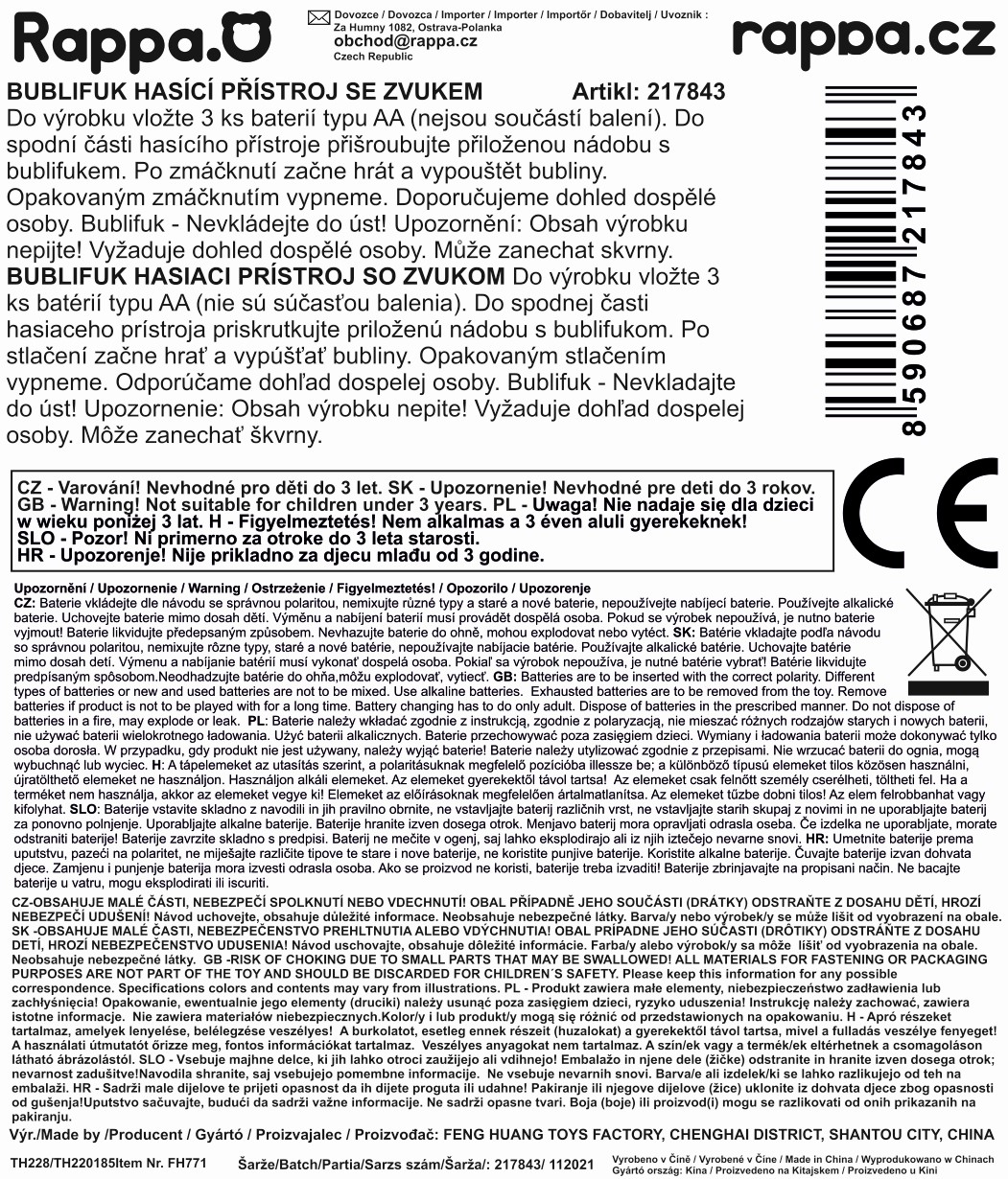 Našroubuj zásobník s tekutinou a bublinkování může začít! Milióny bublinek a spousty zábavy si užiješ s tímto báječným hasičským přístrojem. Funguje při použítí 3 ks baterií typu AA, které nejsou součástí. Vypouští bubliny a současně hraje hudba, ideální pro hru venku nebo v interiéru.