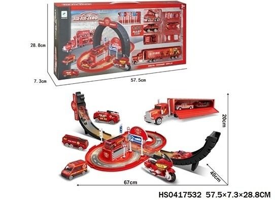 Hasiči velká sada s příslušenstvím (sada) Obsah sady: hasičský dopravní okruh/garáž 2v1 (funkce přeměny z garáže na okruh a zpět), kovový model autíčka 1:64 (6 ks) a kamion.