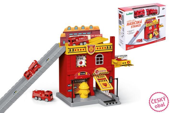 Hasičská stanice. Rozměry 37x17,5x21 cm. Součástí dvě auta. Volná kola. Manuální výtah, otevírací dveře. Nálepky a obrázkový návod na složení součástí balení.