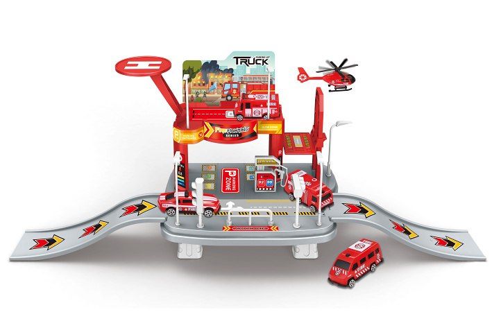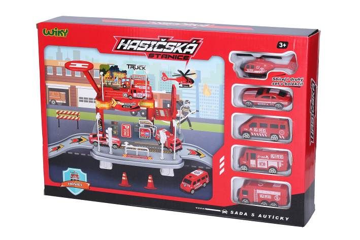 Hasičská stanice s auty. Rozměry 65x19x24,5 cm. Součástí 4 auta 7 cm, 1 vrtulník 9 cm, manuální výtah, heliport, čerpací stanice, značky. Obrázkový návod na složení na boční straně obalu.