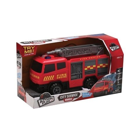Hasičské auto na setrvačník, se zvukovým a světelným efektem a pohyblivými částmi. Auto vyžaduje 2AA baterie, nejsou součástí balení. Pro děti od 3 let. Na baterie: 2x AA (jsou součástí balení)
