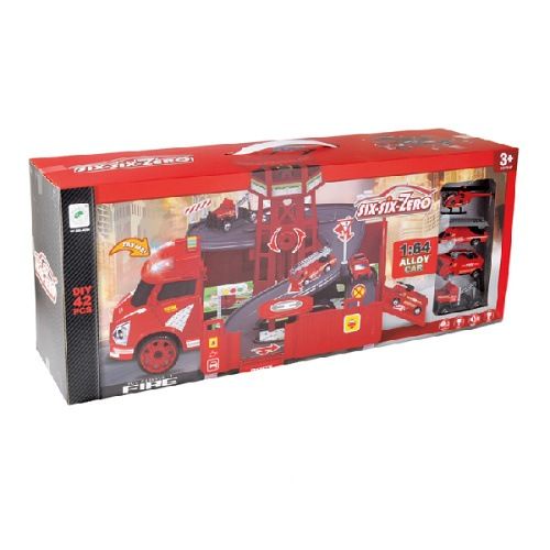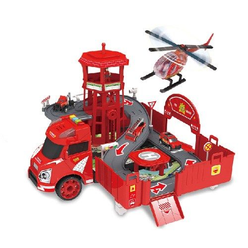 Hasičský kamión se zvukem a světlem, který je rozložitelný na požárnickou základnu. Sada dále obsahuje 3 ks malých autíček, vrtulník a 6 ks dopravního značení. Baterie 3xAG13 jsou součástí balení.