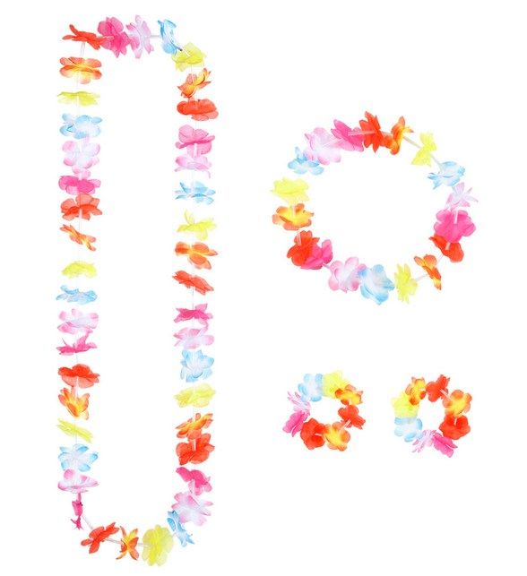 Havajská sada květinových věnců obsahuje věnec na krk, 2 věnečky na ruce a čelenku. Sada stvořrná pro havajskou a letní párty.