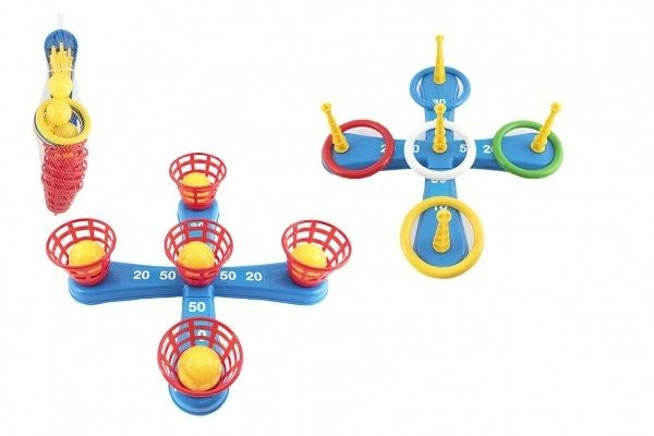 Zábavná hra, při které se hází kroužky na kříž. Balení obsahuje kříž s pěti hroty a pět barevných kroužků. Jednotlivé dílky jsou vyrobené z plastu. Tato hra se bude líbit zejména nejmenším dětem, které mohou sbírat body za každý hod, kdy se jim podaří umístit kroužek na hrot. Natrénují si také přesnost a trpělivost. Druhá hra funguje na stejný princip, ale hroty nahradily košíčky na míčky.