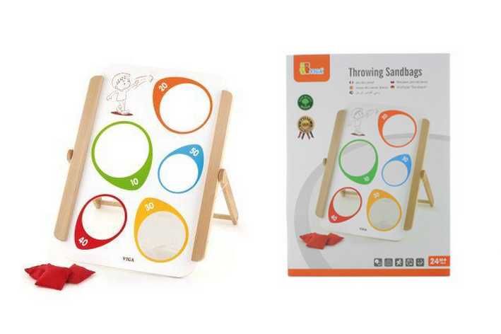 Hra házení pytlíků s pískem do otvorů, za každý otvor je určitý počet bodů. Rozměry hračky cca 34,5 x 44,5 x 31 cm. Rozměry balení cca 36 x 49 x 3,5 cm. Věk 2+