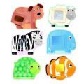 Kromě sestavování 6 velkých dvoudílných dílků puzzle mohou děti procvičovat své smyslové vnímání vyhledáváním speciálních kartiček, kde každá odpovídá jinému zvířátku.