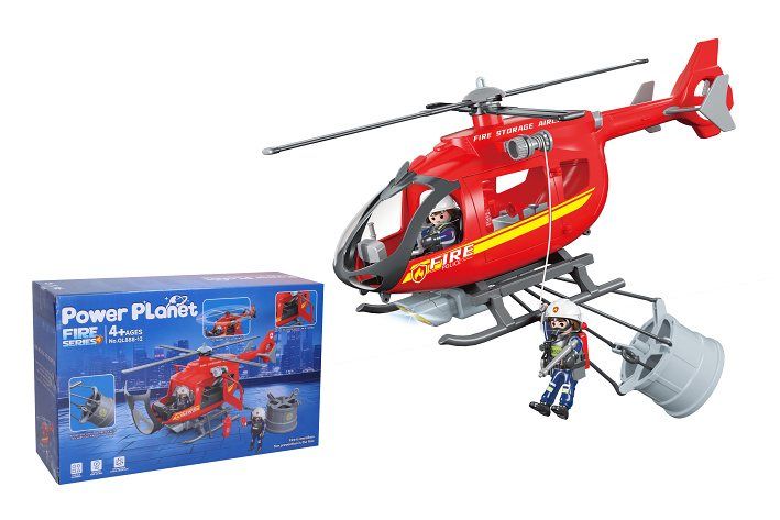 Helikoptéra hasiči s efekty. Velikost 38cm. Helikoptéra má otevírací dveře a kabinu, vejdou se dovnitř dva panáčci. Světelné a zvukové efekty. Návod uvnitř. Baterie 3xLR44 součástí